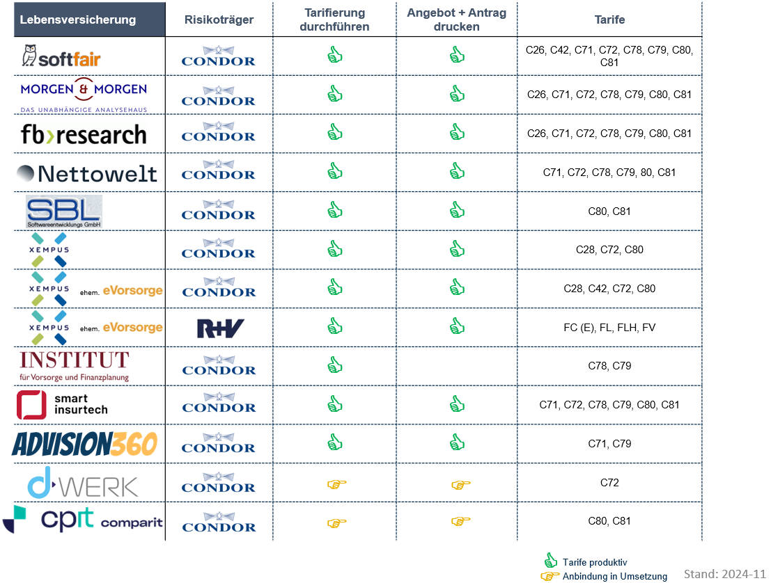 Für Privatkunden Komposittarife unterstützen wir die BiPRO-Norm 421 (Tarifierung, Angebot und Antrag inkl. Online-Versand). Für Firmenkunden Komposittarife unterstützen wir die BiPRO-Norm 426 (Tarifierung, Angebot und Antrag inkl. Online-Versand). Für die Tarife der Lebensversicherung unterstützen wir die BiPRO-Norm 422 (Tarifierung, Angebot und Antragsdruck). Der Webservice für die Tarife der Krankenversicherung BiPRO-Norm 424 ist gerade in der Umsetzung. Unser Webservice für das Kfz-Geschäft ist ein proprietärer Webservice (Tarifierung, Angebot und Antrag inkl. Online-Versand) und entspricht nicht der BiPRO-Norm 423. Die BiPRO-Norm 425 wird von uns nicht unterstützt.