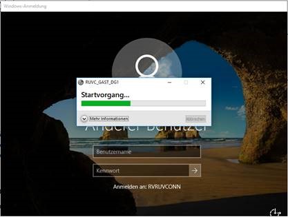 Während des Startvorgangs gibt es im Hintergrund des bekannten Fensters mit dem Fortschrittsbalken noch ein Fenster „Windows Anmeldung“.