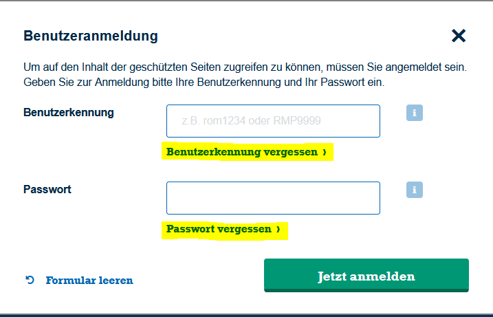 Mit der "Passwort vergessen - Funktion" setzen Sie schnell und einfach Ihr Passwort zurück. Die Anwendung kann zu jederzeit per Klick auf "Anmelden" im Headerbereich von Ihnen unabhängig von unserem Benutzerservice bedient werden.