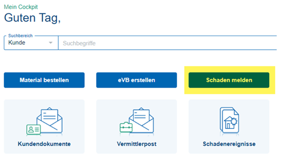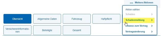 Sie finden die Schadenmeldefunktion nach dem Login im Maklerportal an mehreren Punkten, so. z.B. in „Mein Cockpit“, über die drei Punkte in der Vertragsliste und über die drei Punkte in den Vertragsdetails.