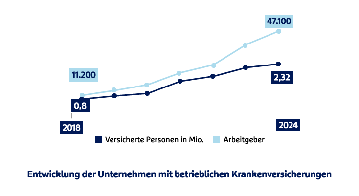 Die BKV boomt2024 boten mehr als 47.000 Unternehmen eine betriebliche Krankenversicherung, wovon über 2,3 Mio. Personen die betriebliche Absicherung in Anspruch genommen haben. |