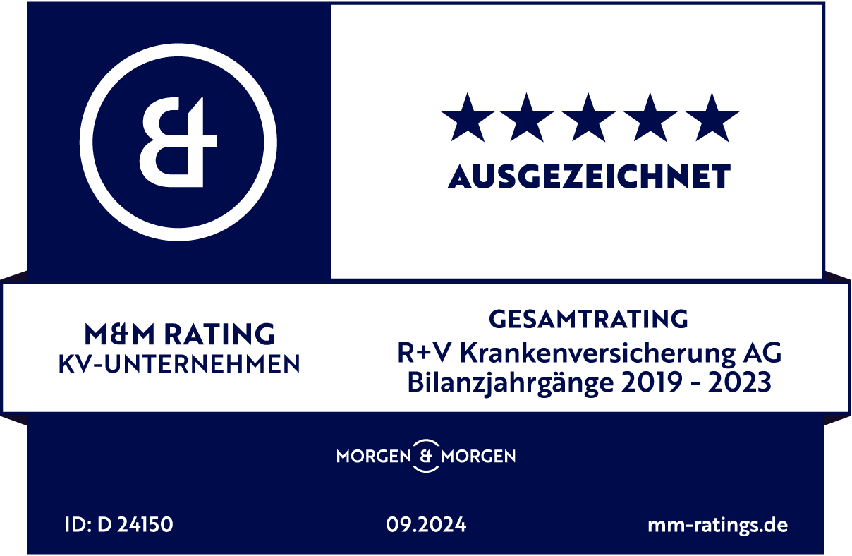 |  | September 2024 - Ratingagentur MORGEN & MORGEN (KV-Unternehmen) Das unabhängige Analysehause MORGEN & MORGEN hat in einer umfangreichen Untersuchung 30 private Krankenversicherer bewertet. Die R+V Krankenversicherung erhält erneut fünf Sterne, was der Bestnote "Ausgezeichnet" entspricht. Grundlage waren Bilanzkennzahlen aus den Bereichen Erfolg, Leistung, Wachstum, Bestand, Sicherheit und Finanzierbarkeit der letzten 5 Bilanzjahrgänge. |