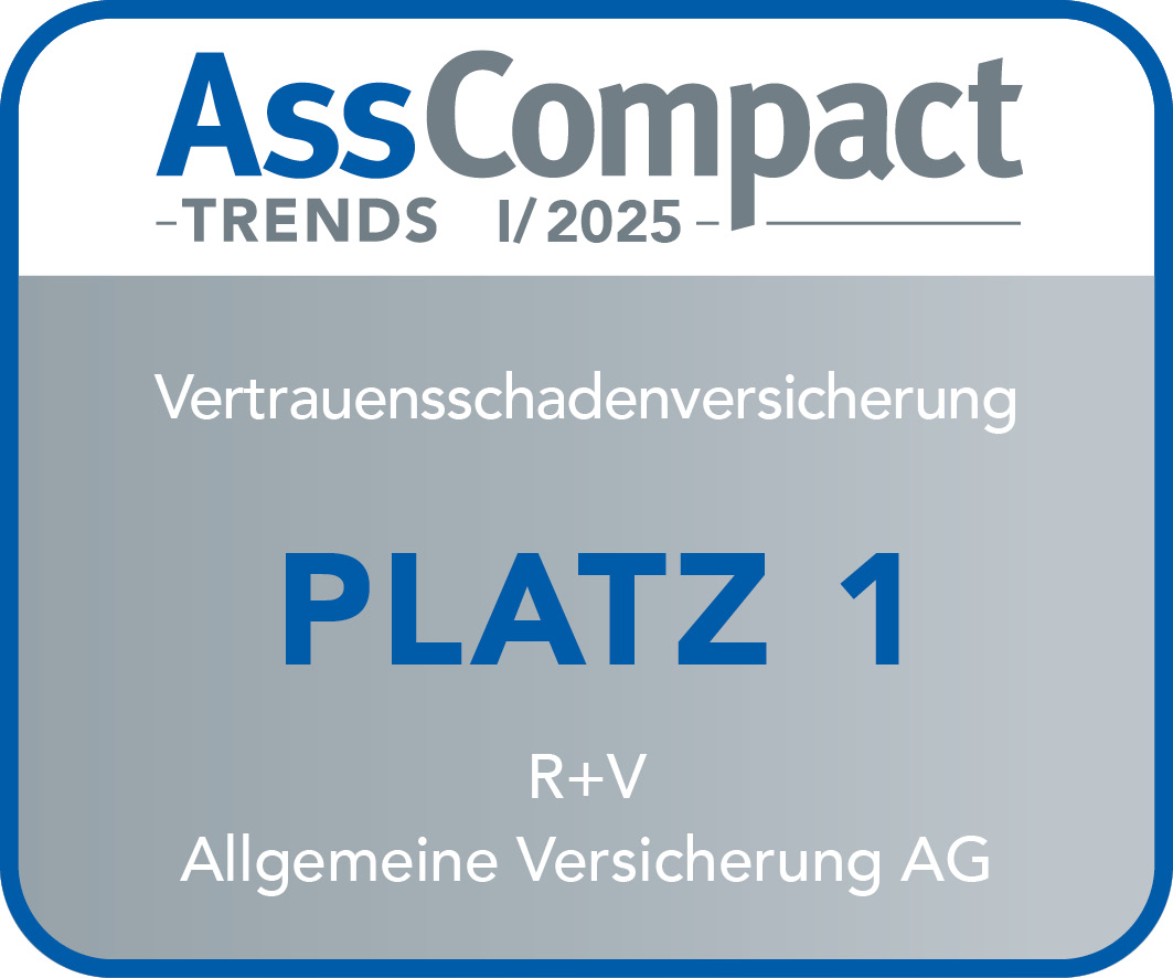 |  | Januar 2025 - AssCompact Platz 1 bei der Vertrauensschadenversicherung R+V schafft es auf Platz 1 im Vertrauensschadengeschäft. Dafür gab es die Auszeichnung "AssCompact Trends – Vertrauensschadenversicherung 2025". |