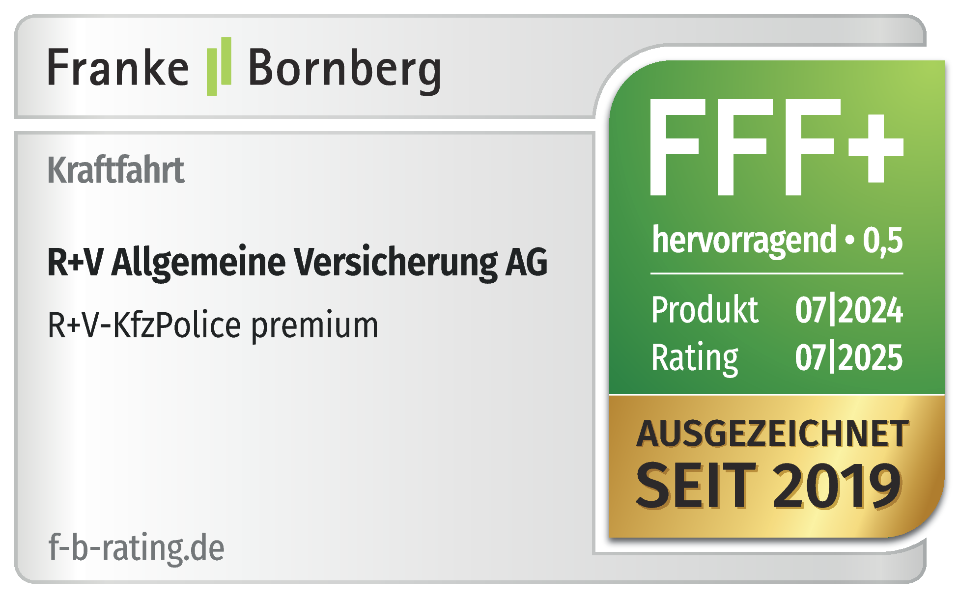 |  | Juli 2024 - Ratingagentur Franke und Bornberg Die unabhängige Ratingagentur Franke und Bornberg zeichnet die R+V-KfzPolice premium mit hervorragend (FFF+) aus. FFF+ ist die höchste erreichbare Bewertung. Das Kfz-Rating berücksichtigt den Versicherungsumfang sehr detailliert und bewertet ausschließlich harte nachvollziehbare Fakten wie u.a. Leistungsumfang, Ausschlüsse und Transparenz der Bedingungen. |