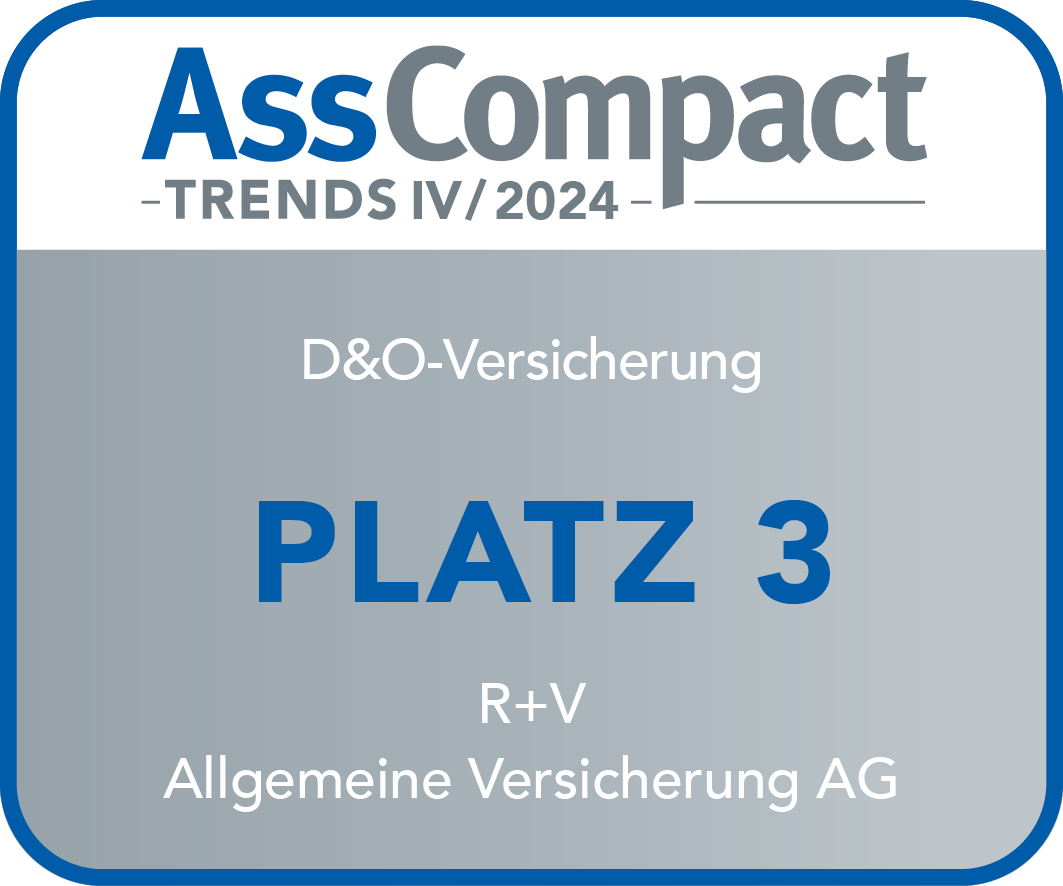 |  | November 2024 - AssCompact Platz 3 bei der D&O-Versicherung R+V schafft es auf Platz 3 im D&O-Geschäft. Dafür gab es die Auszeichnung "AssCompact Trends – D&O-Versicherung 2024". |