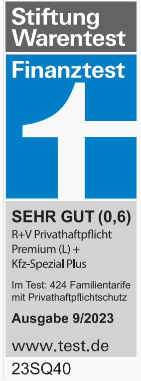 | Ausgabe 9/2023 - Finanztest Finanztest zeichnet die R+V Privathaftpflichtversicherungen Omnikanal als Testsieger aus. Der Tarif Premium (L) in Kombination mit dem Zusatzbaustein Kfz-Spezial erhält die Note „Sehr Gut (0,6)“. Insgesamt waren 424 Tarife von 98 Versicherern im Test. |