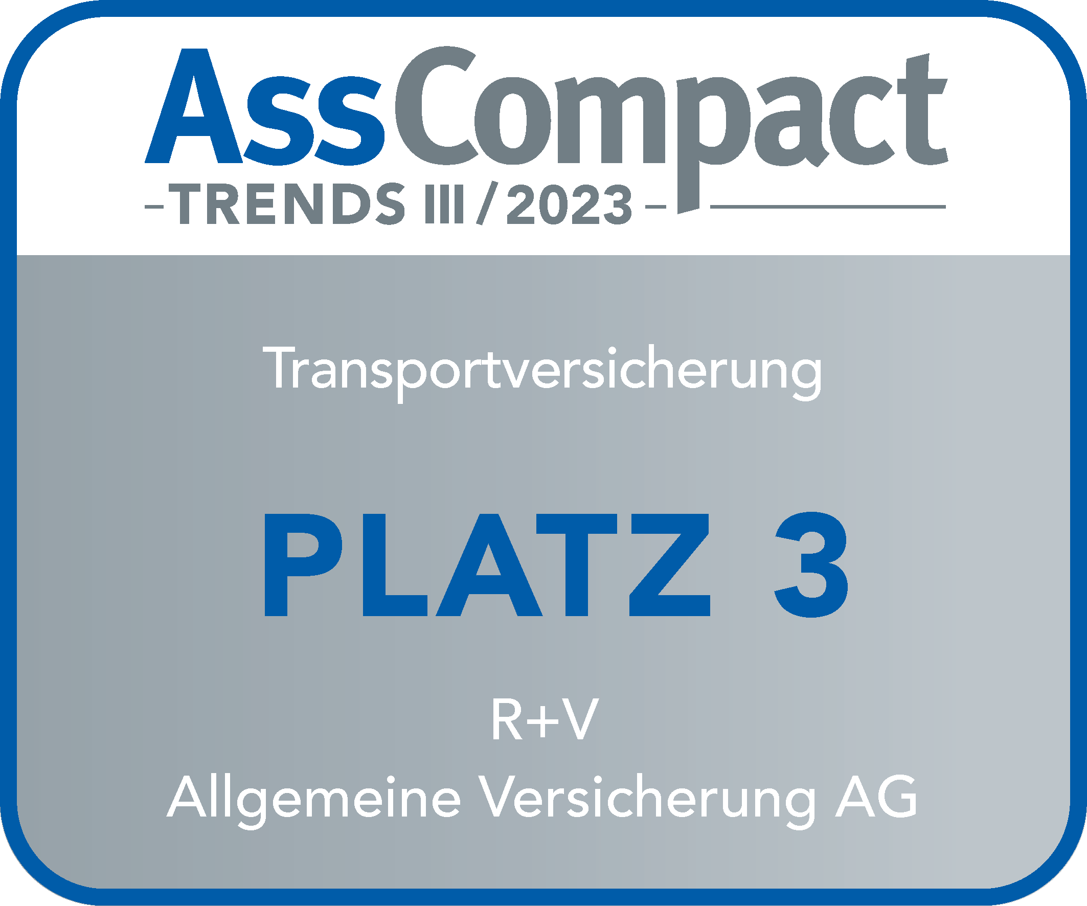 |  | Platz 3 bei der Transportversicherung R+V belegt im Bereich Transport den dritten Platz. Dafür gab es die Auszeichnung von „AssCompact Trends – Transportversicherung 2023“. |