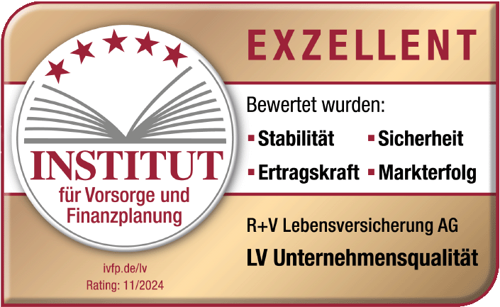 |  | November 2024 - Institut für Vorsorge und Finanzplanung (IVFP) Die R+V Krankenversicherung ist erneut mit der Bestnote "0,7 – Exzellent" im Rating KV-Unternehmensqualität 2024 des Instituts für Vorsorge und Finanzplanung (IVFP) ausgezeichnet worden. Bewertet wurden die Bereiche Stabilität, Sicherheit, Ertragskraft und Markterfolg. |