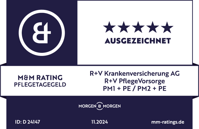 |  | November 2024 - Ratingagentur MORGEN & MORGEN Pflegevorsorge Das unabhängige Analysehause MORGEN & MORGEN hat in einer umfangreichen Untersuchung 229 Pflegetage- und -monatsgelder bewertet. Die Tarife PM1 + PE sowie PM2 + PE der R+V Krankenversicherung wurden mit 5 von 5 Sternen – der Bestnote "Ausgezeichnet" – bewertet und gehören damit zur Spitzengruppe der Pflegemonatsgelder. |
